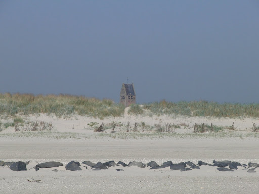 Daarna lekker op het strand gespeeld en gewandeld van waaruit je nog juist over de toppen van de duinen het zadeldak ziet van de kerk van Hollum (zie foto). Op de terugweg viel het me op dat er ook nog diverse Vermaningen op het eiland zijn, een overblijfsel van de Doopsgezinde invloed die begin 17e eeuw op kwam in de regio.